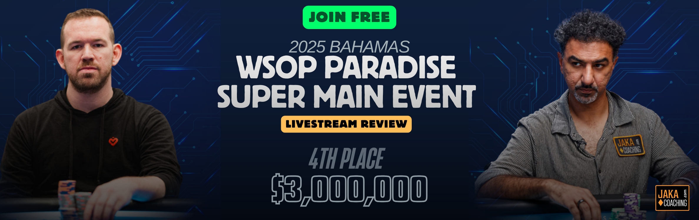 Join TJ Reid, fresh off a 7 figure final table run, and world-class poker coach Faraz Jaka for an official livestream review of TJ’s massive 4th place, $3,000,000 finish at the $25,000 Super Main Event at WSOP Paradise in the Bahamas.